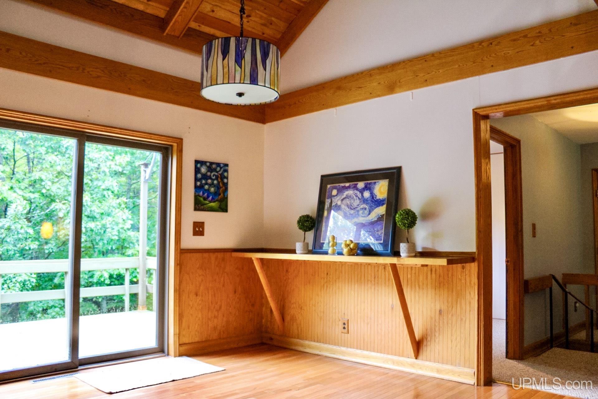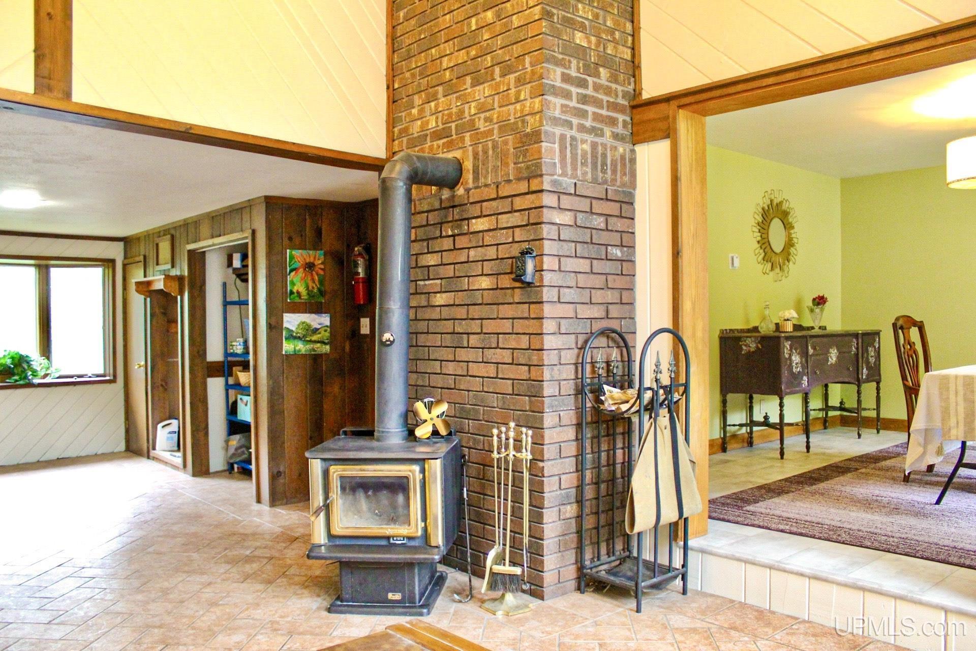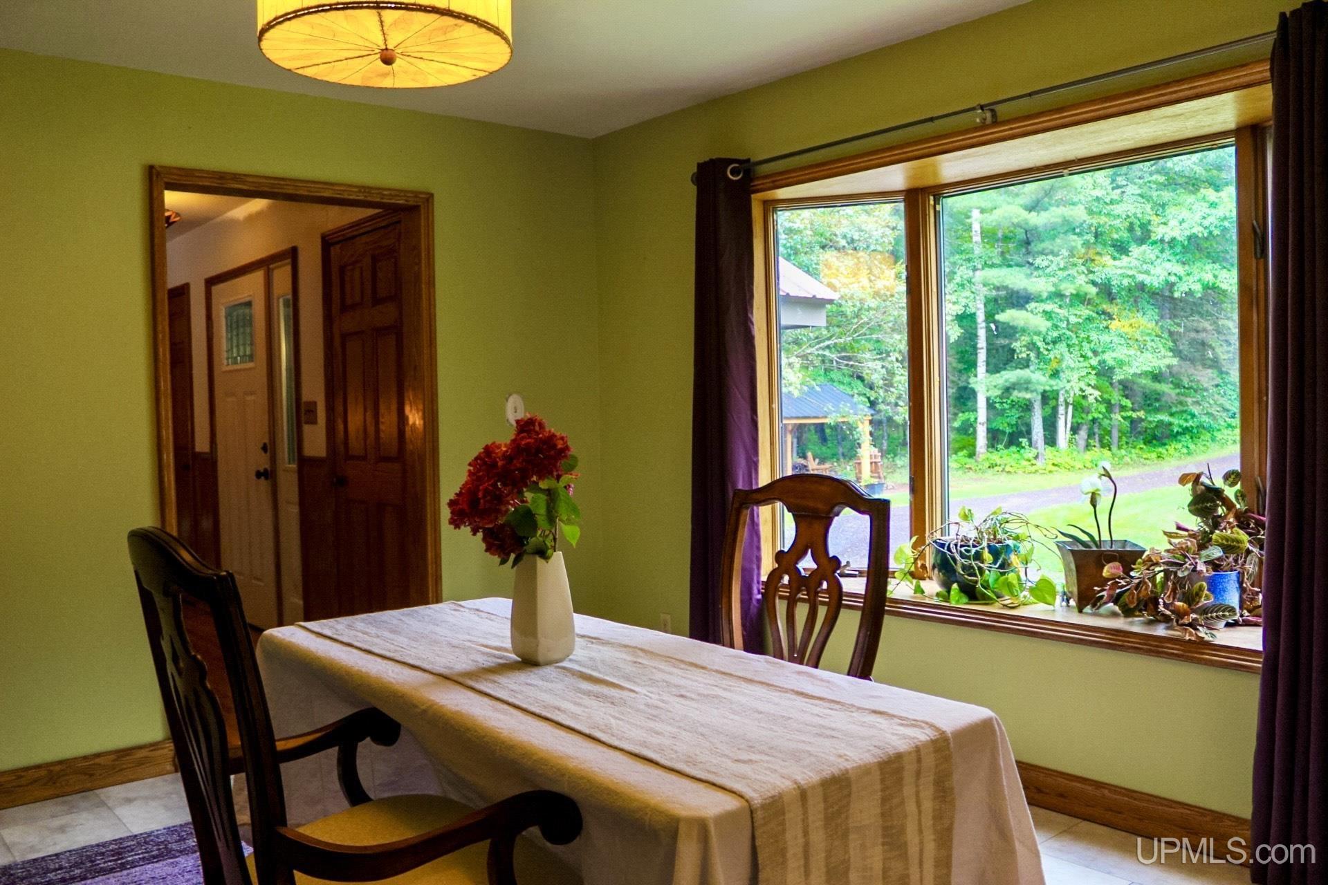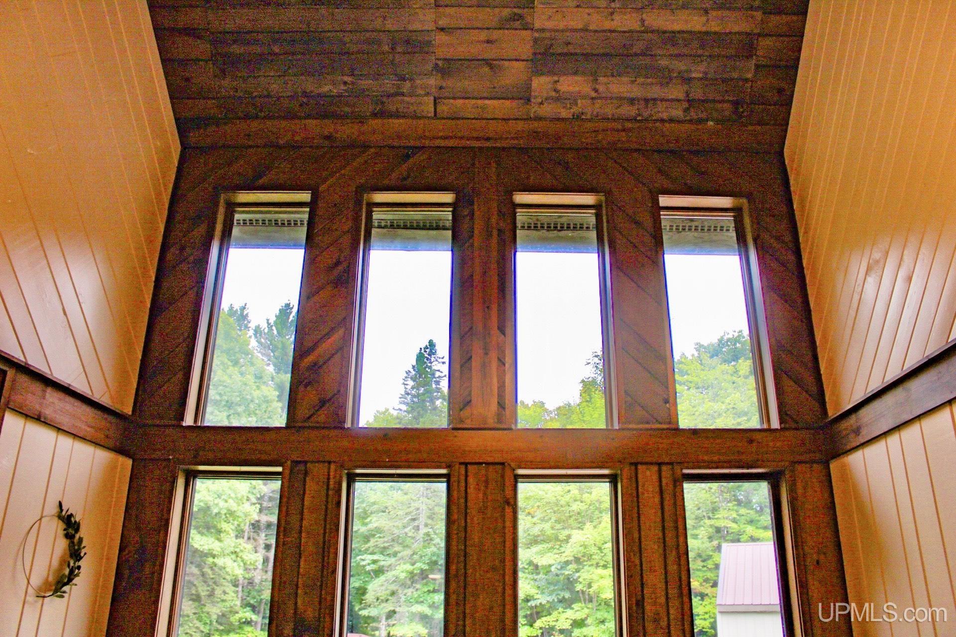 A beautiful home with an unbeatable location outside of Houghton! This four bedroom, four bathroom home on Springbrook Road provides plenty of interior space and acreage. It also has a pole barn with an attached lean-to and a firepit area. Step into the spacious main floor which has a beautiful view of the forest and creek below. The bright and remodeled kitchen has corian countertops and custom cabinetry. Newer appliances and furnishings throughout the home, yet with a classic and comfortable feel. Large living room with a sunken conversation pit and a powder room. Formal dining room is connected to the kitchen and entryway. There's also a space near the living room which has been used as an office. Stunning double story windows in the family room. There's a woodstove included in the family room as well. Laundry room/mudroom are also located on the main floor with convenient access to the two-car garage. There's an open studio space located above the garage which could be turned into living quarters. Take the staircase up to the second floor, where you can find the primary suite with an attached bathroom. In addition, there's a brand-new bathroom with a soaking tub and custom tile. Two other bedrooms round out the second floor. Head downstairs, where you can take the spiral staircase to the walk-out basement. There's a bar area and plenty of room with an office and additional storage. Also, you can find a large hot tub and sauna. There's a powder room and a bathroom with a shower. The tree-lined exterior features a paver patio with a flat yard, apple trees, and a peaceful forest with a brook. This property has an amazing location, with true country living yet only 5 minutes from the City of Houghton! Check out this fine home at an even better price today!