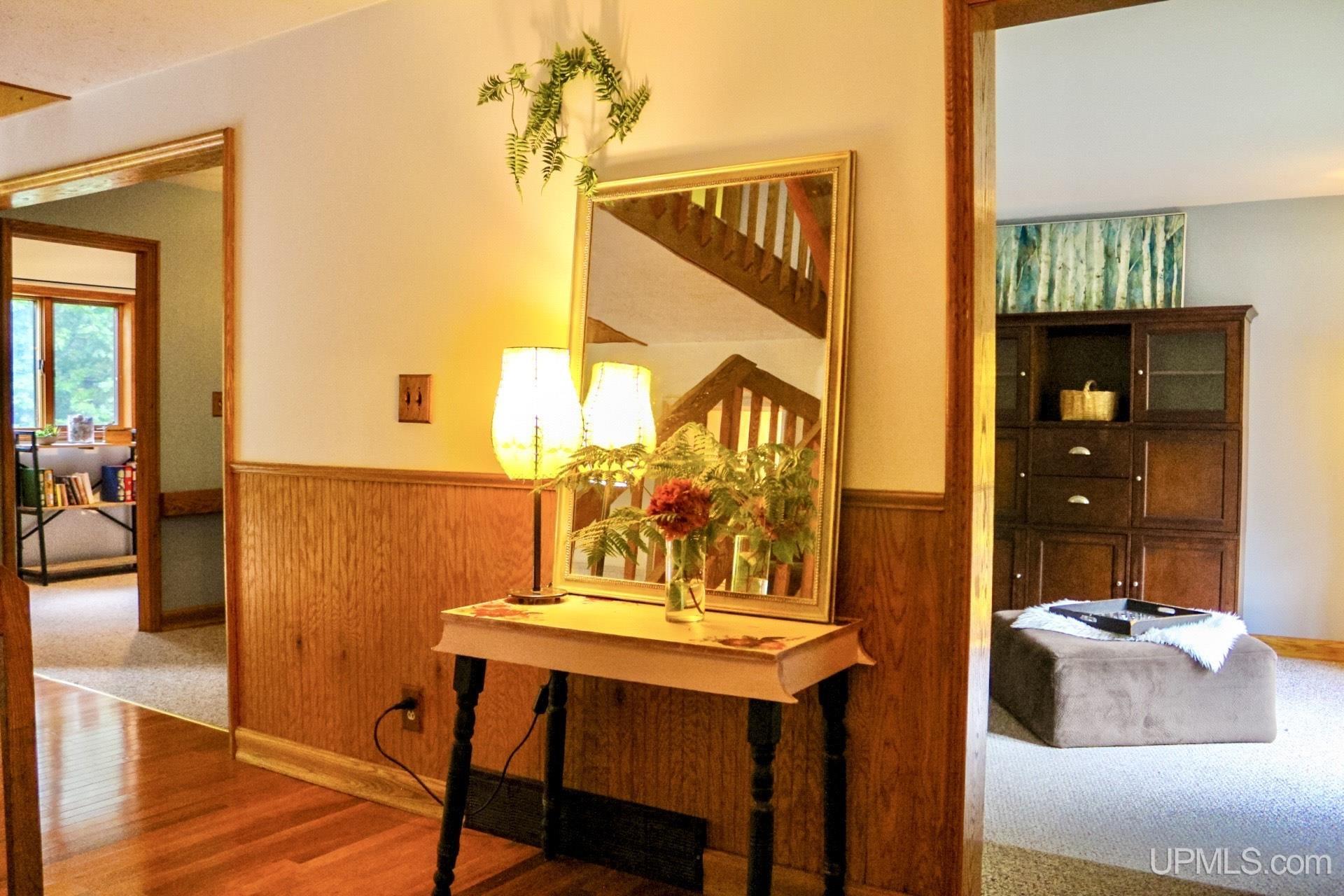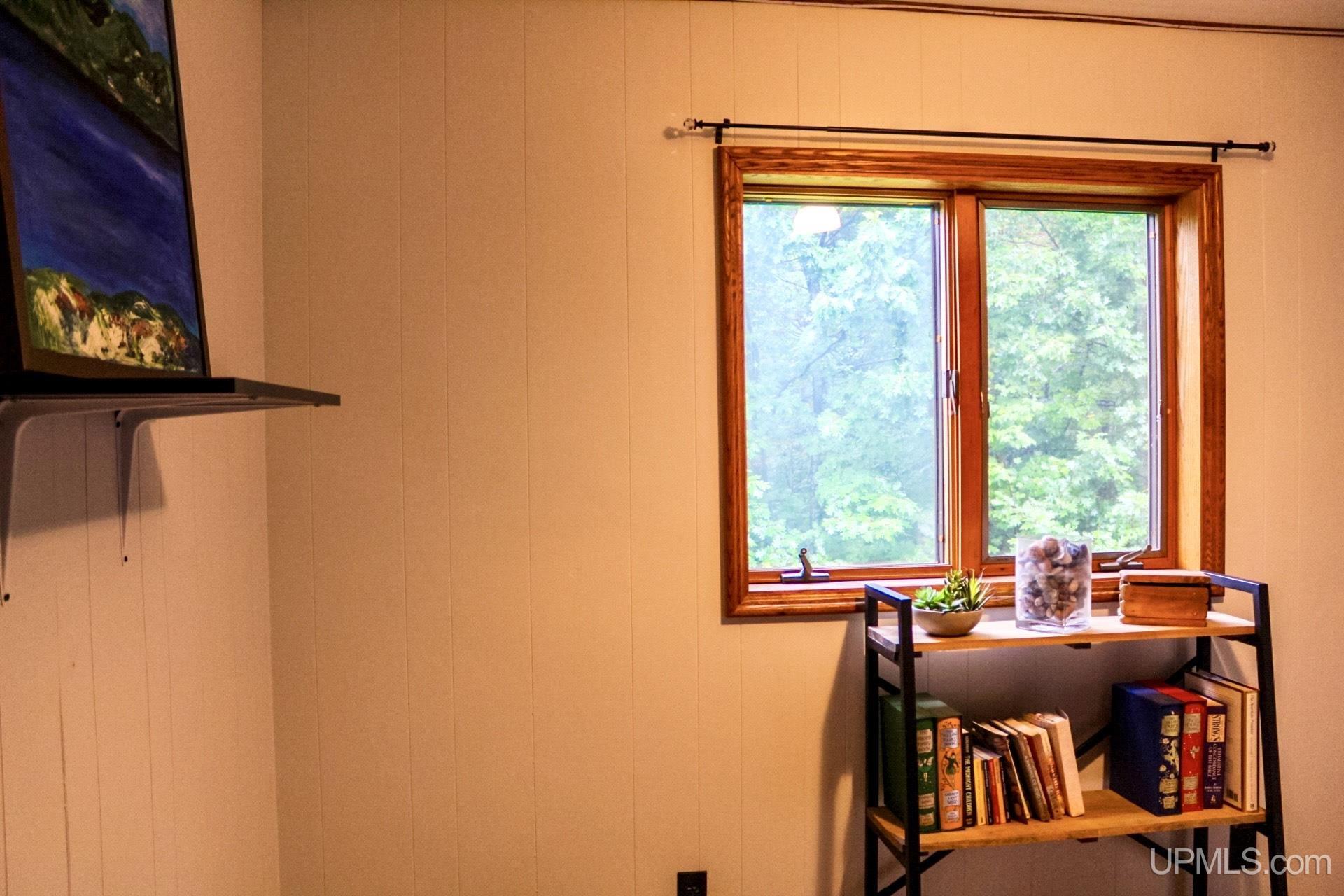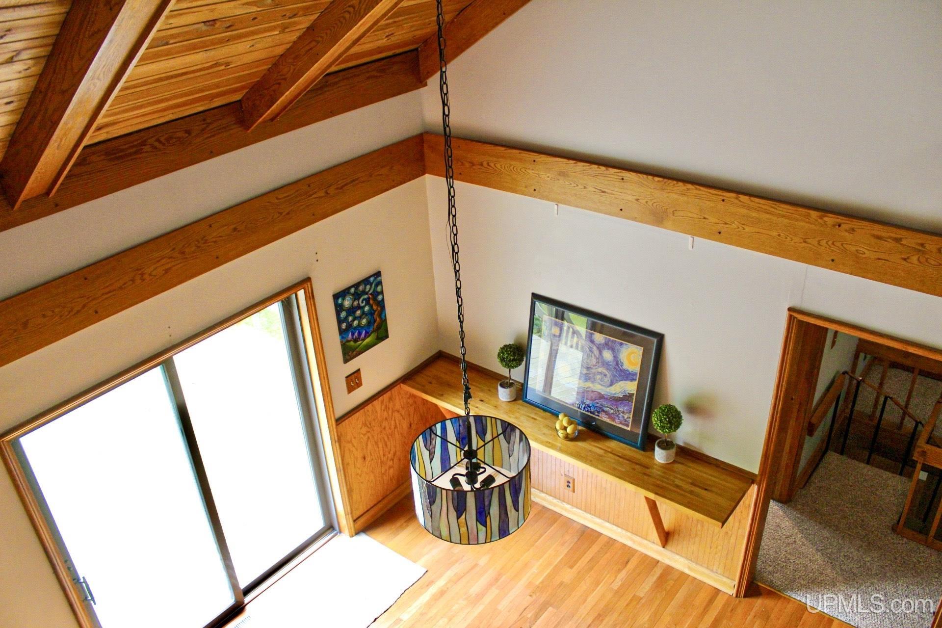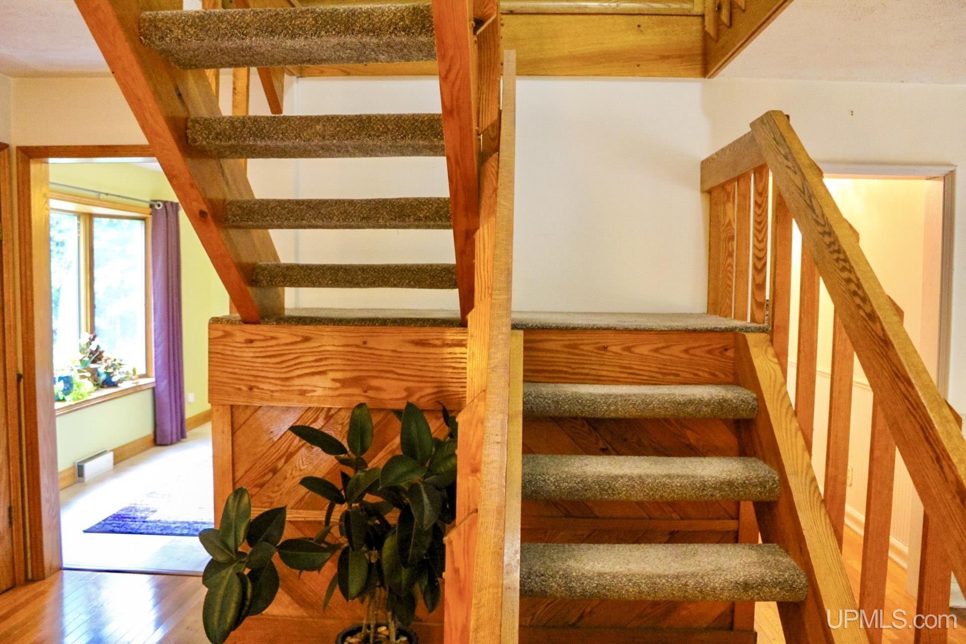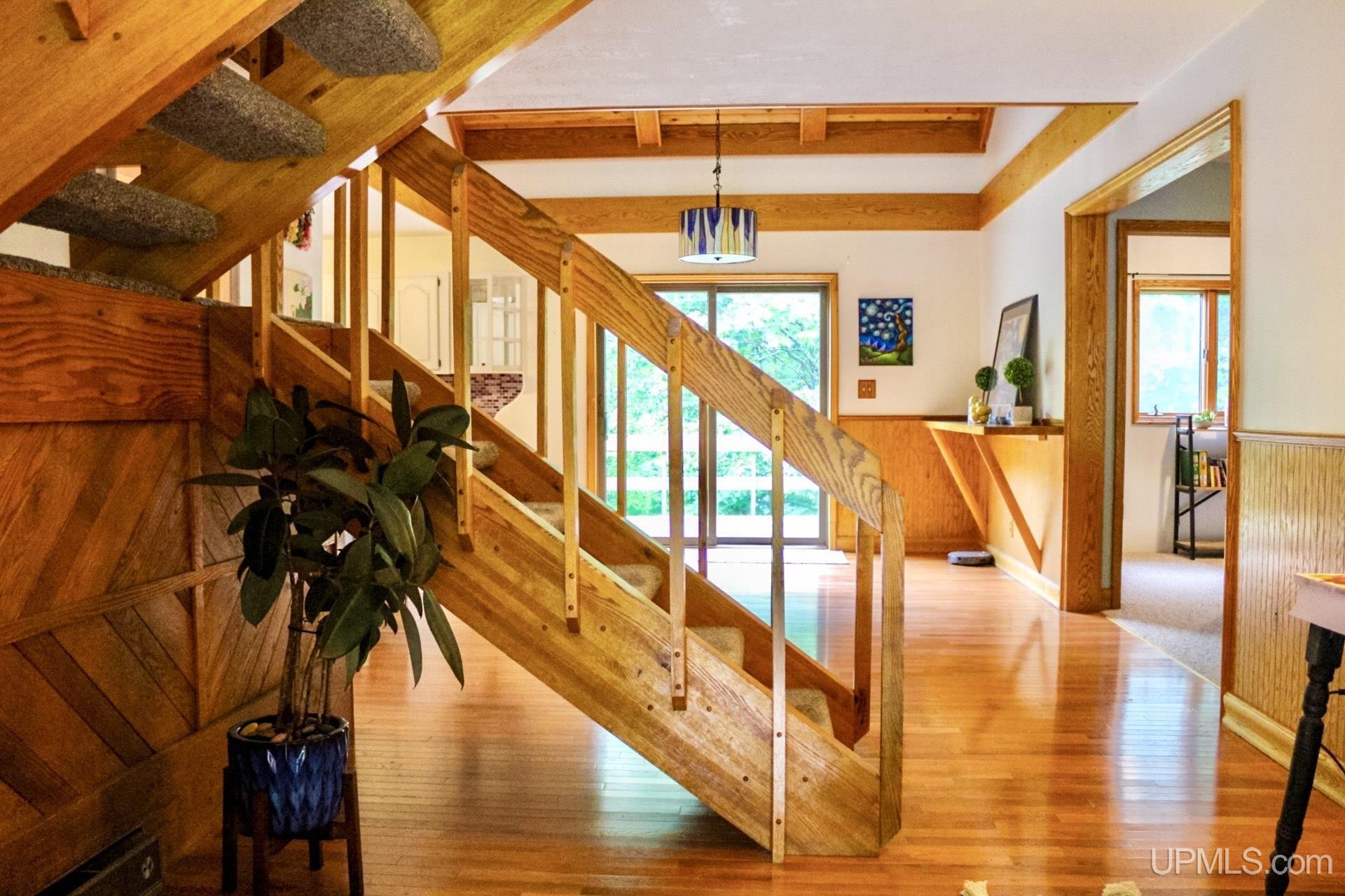 A beautiful home with an unbeatable location outside of Houghton! This four bedroom, four bathroom home on Springbrook Road provides plenty of interior space and acreage. It also has a pole barn with an attached lean-to and a firepit area. Step into the spacious main floor which has a beautiful view of the forest and creek below. The bright and remodeled kitchen has corian countertops and custom cabinetry. Newer appliances and furnishings throughout the home, yet with a classic and comfortable feel. Large living room with a sunken conversation pit and a powder room. Formal dining room is connected to the kitchen and entryway. There's also a space near the living room which has been used as an office. Stunning double story windows in the family room. There's a woodstove included in the family room as well. Laundry room/mudroom are also located on the main floor with convenient access to the two-car garage. There's an open studio space located above the garage which could be turned into living quarters. Take the staircase up to the second floor, where you can find the primary suite with an attached bathroom. In addition, there's a brand-new bathroom with a soaking tub and custom tile. Two other bedrooms round out the second floor. Head downstairs, where you can take the spiral staircase to the walk-out basement. There's a bar area and plenty of room with an office and additional storage. Also, you can find a large hot tub and sauna. There's a powder room and a bathroom with a shower. The tree-lined exterior features a paver patio with a flat yard, apple trees, and a peaceful forest with a brook. This property has an amazing location, with true country living yet only 5 minutes from the City of Houghton! Check out this fine home at an even better price today!