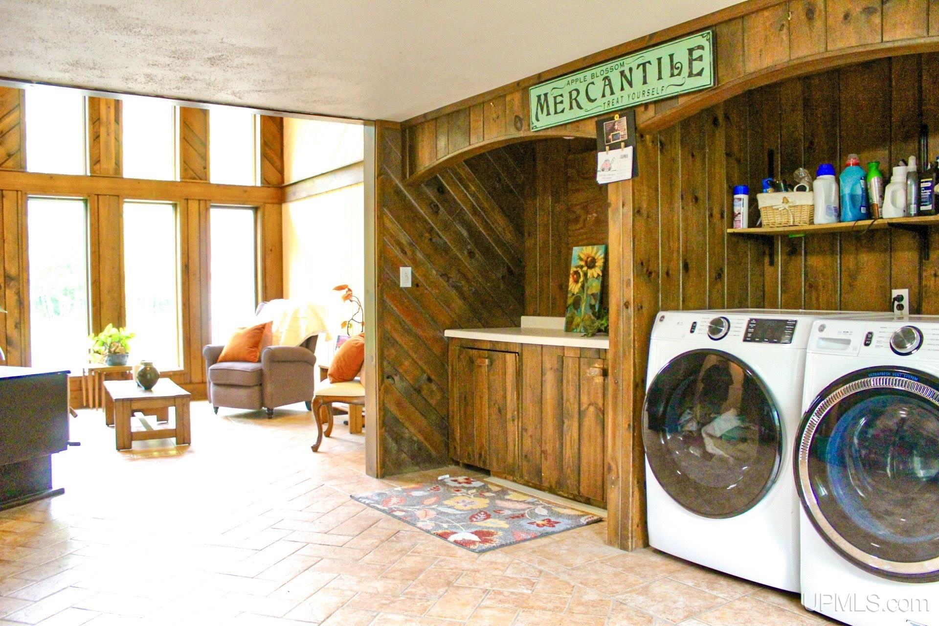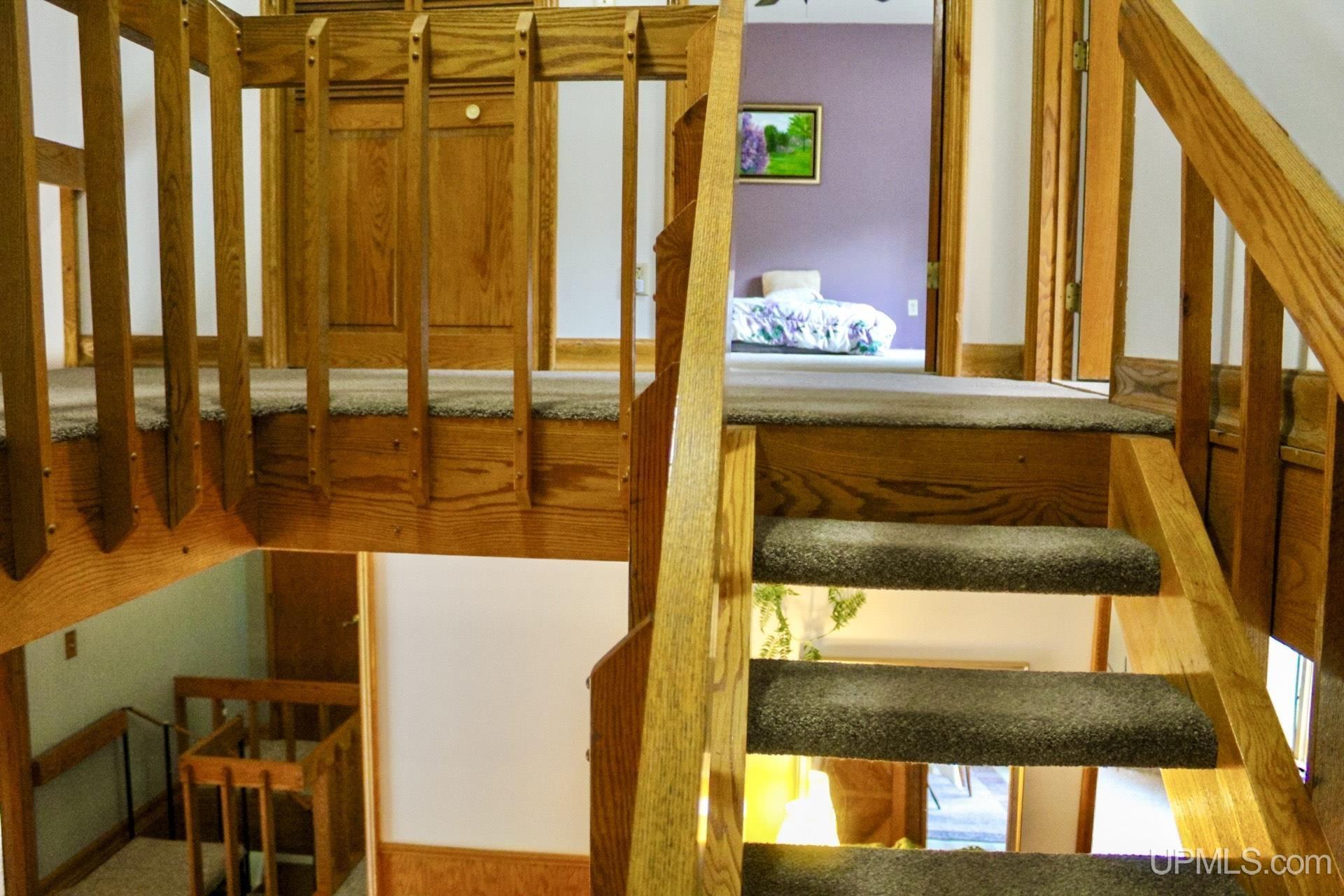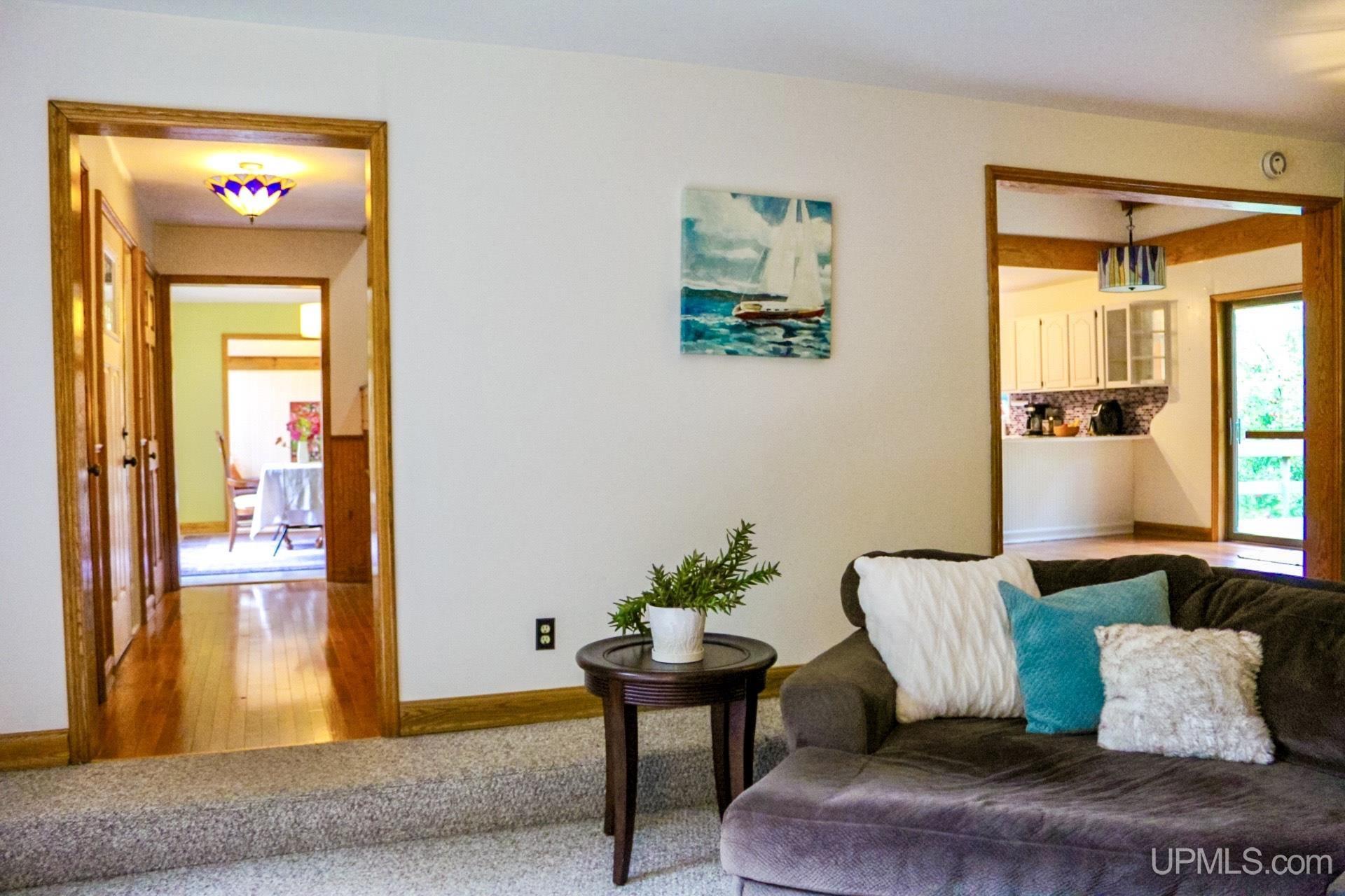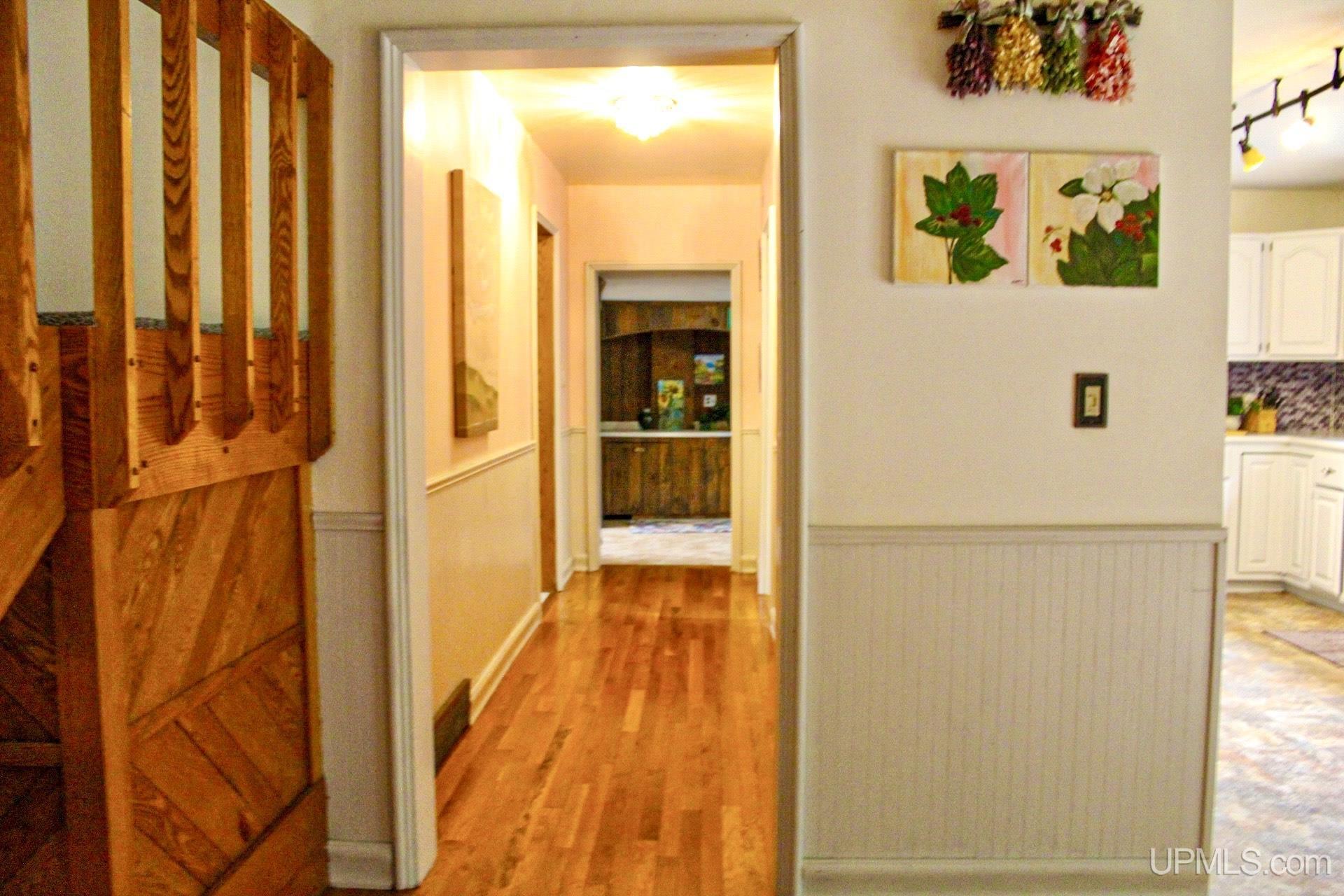 A beautiful home with an unbeatable location outside of Houghton! This four bedroom, four bathroom home on Springbrook Road provides plenty of interior space and acreage. It also has a pole barn with an attached lean-to and a firepit area. Step into the spacious main floor which has a beautiful view of the forest and creek below. The bright and remodeled kitchen has corian countertops and custom cabinetry. Newer appliances and furnishings throughout the home, yet with a classic and comfortable feel. Large living room with a sunken conversation pit and a powder room. Formal dining room is connected to the kitchen and entryway. There's also a space near the living room which has been used as an office. Stunning double story windows in the family room. There's a woodstove included in the family room as well. Laundry room/mudroom are also located on the main floor with convenient access to the two-car garage. There's an open studio space located above the garage which could be turned into living quarters. Take the staircase up to the second floor, where you can find the primary suite with an attached bathroom. In addition, there's a brand-new bathroom with a soaking tub and custom tile. Two other bedrooms round out the second floor. Head downstairs, where you can take the spiral staircase to the walk-out basement. There's a bar area and plenty of room with an office and additional storage. Also, you can find a large hot tub and sauna. There's a powder room and a bathroom with a shower. The tree-lined exterior features a paver patio with a flat yard, apple trees, and a peaceful forest with a brook. This property has an amazing location, with true country living yet only 5 minutes from the City of Houghton! Check out this fine home at an even better price today!