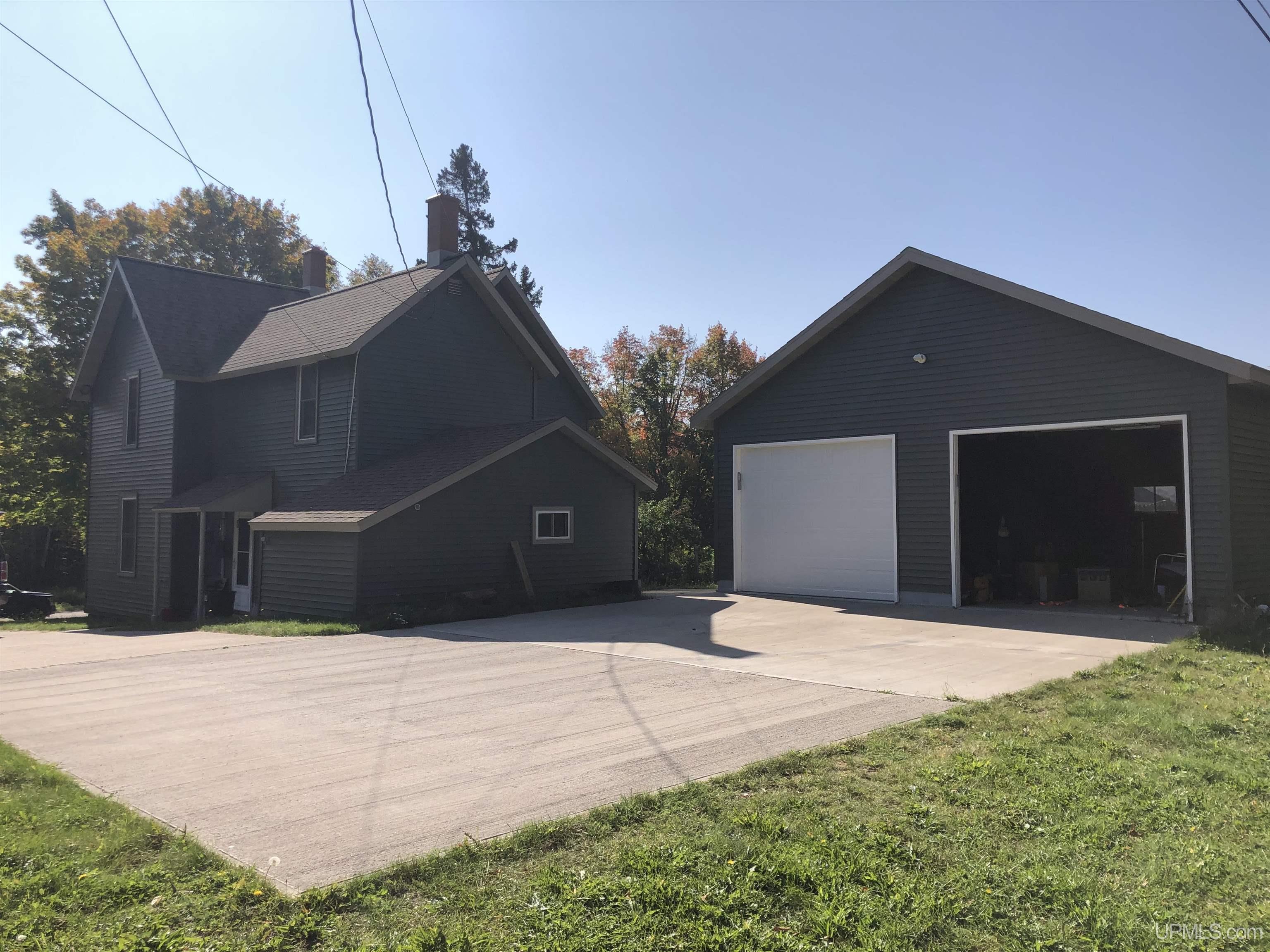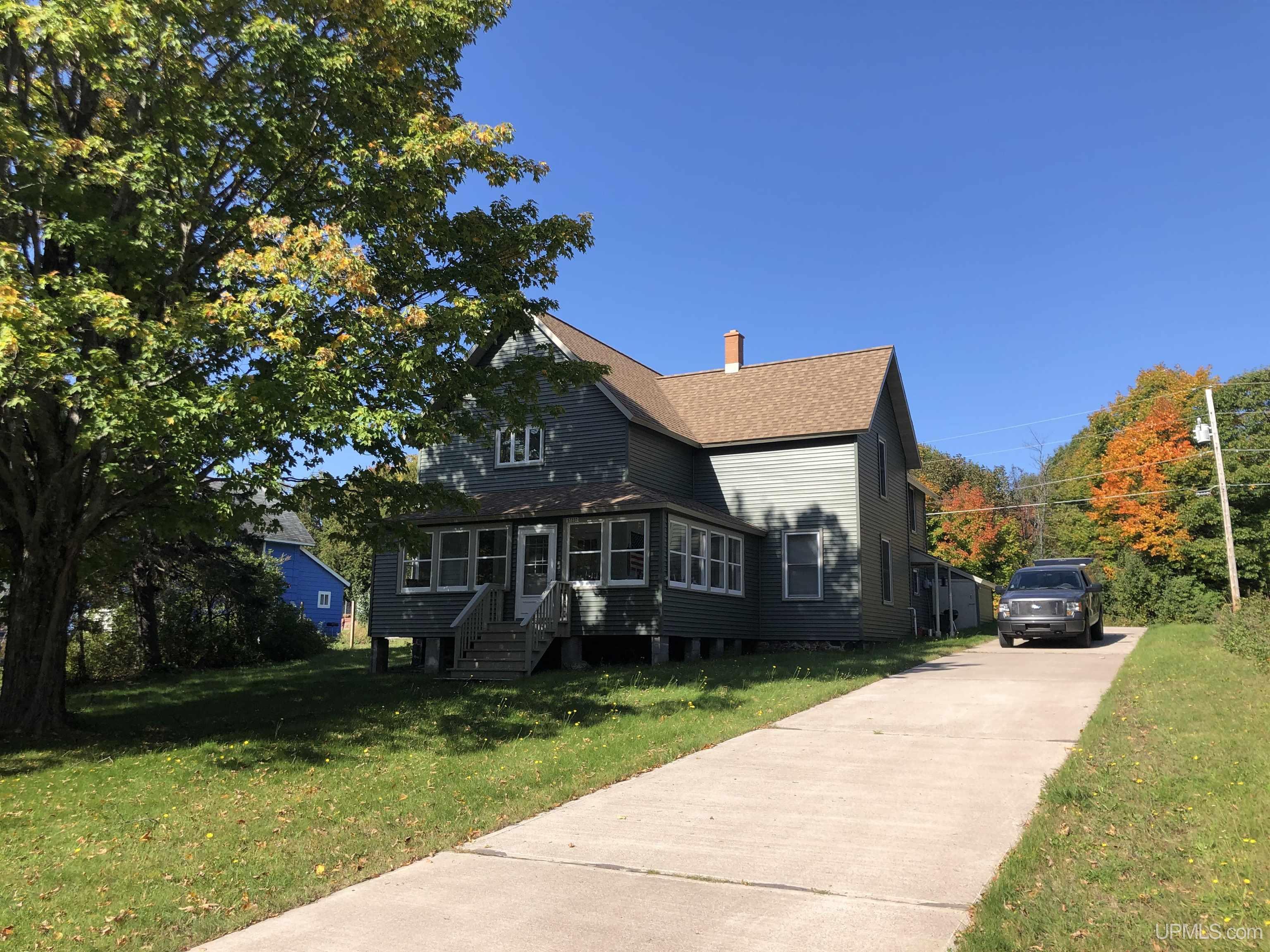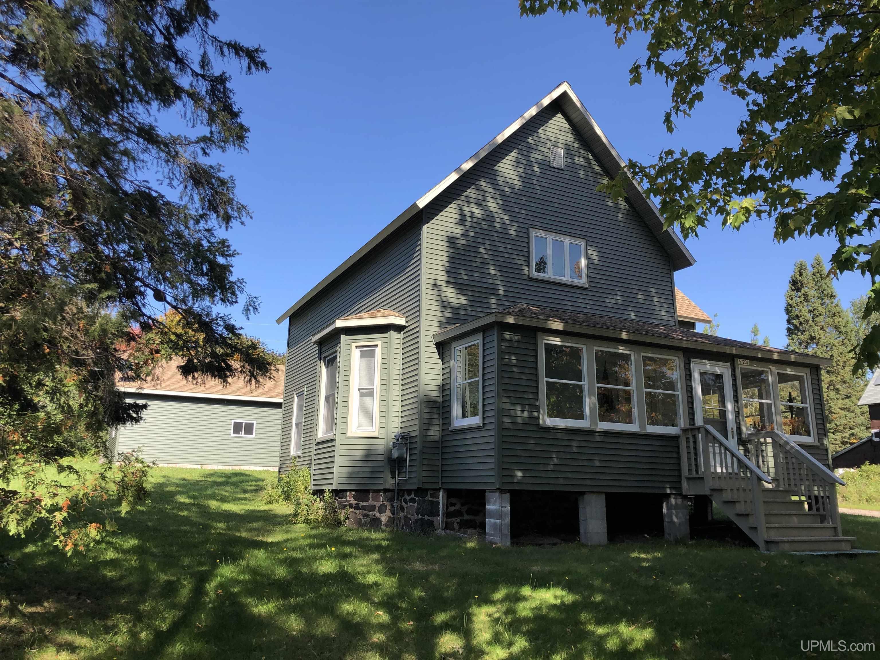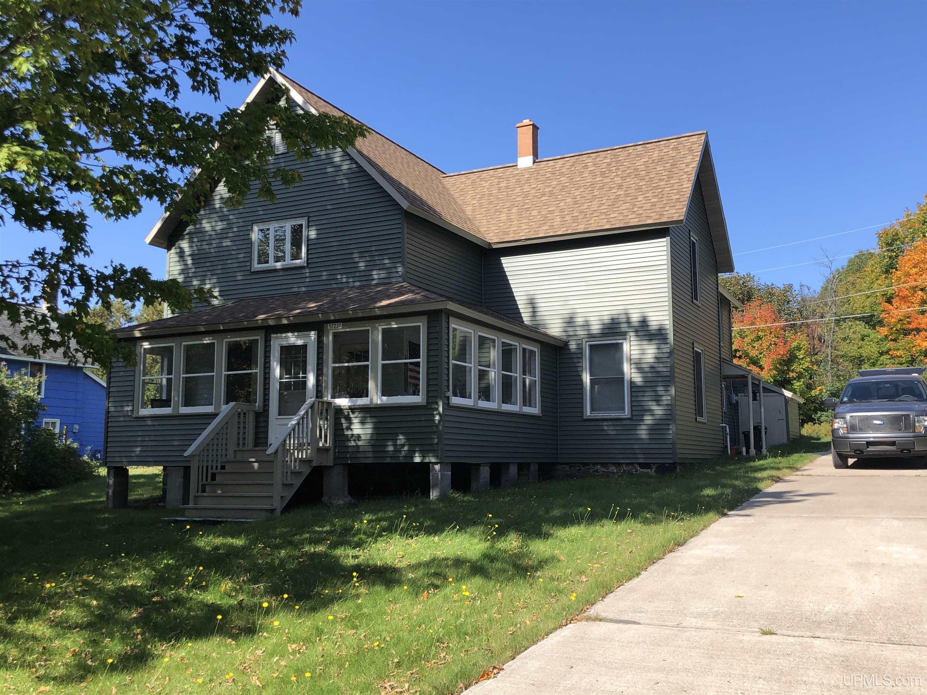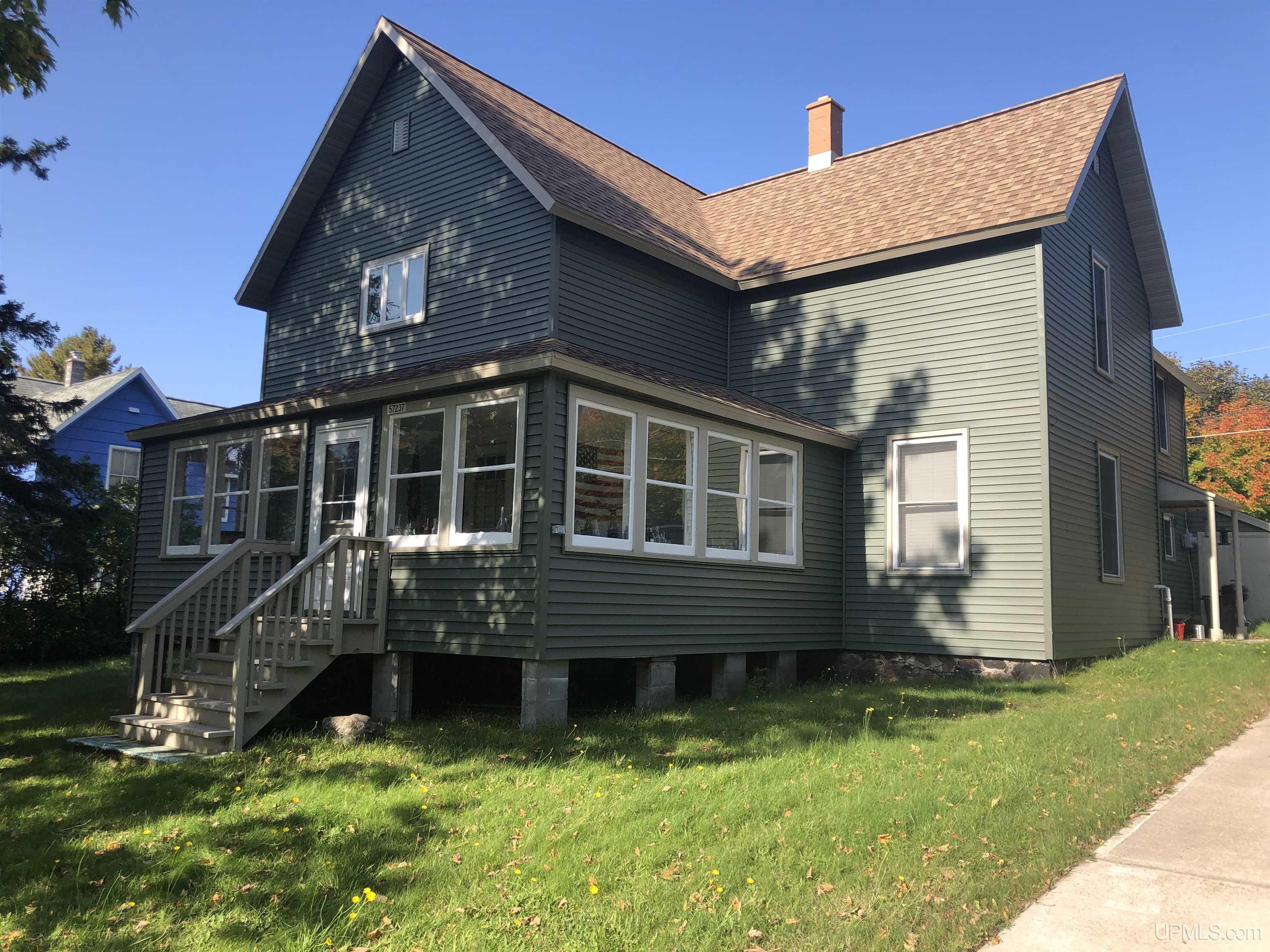 Spacious historic Calumet home with great curb appeal and a wraparound porch. Updates include roof, siding, and a 26x30 detached garage. Features a fully remodeled kitchen with quality wood cabinetry, hardwood floors, and updated windows. Main level has a parlor, dining room, and full bath. Upstairs offers four bedrooms, a second bath, and front and rear stairways. A nice blend of historic charm and practical updates near schools, parks, and downtown.